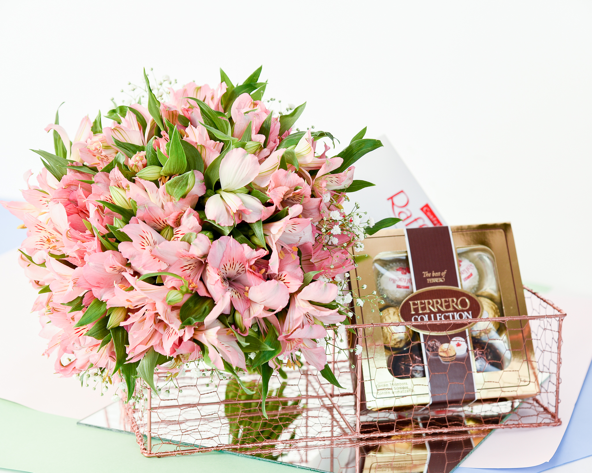 Uma linda cesta composta por um delicado arranjo de astromélias frescas em tons suaves e vibrantes, cuidadosamente dispostas para transmitir elegância e beleza. Ao lado do arranjo, duas delícias irresistíveis: uma caixa de bombons Ferrero Rocher, famosos por sua textura crocante e recheio cremoso, e uma caixa de Rafaello, que combina o sabor único do coco com um toque de amêndoas. Tudo montado em uma cesta charmosa, perfeita para presentear em ocasiões especiais e encantar com sofisticação e carinho.